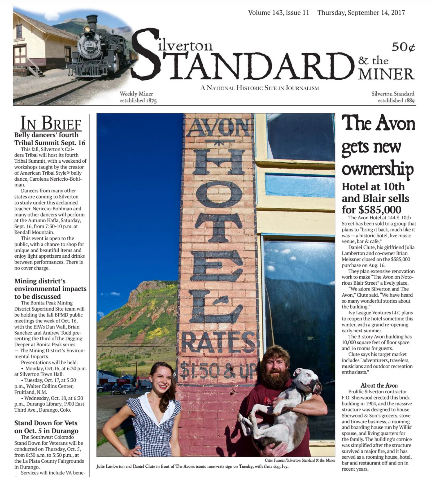 It is no longer a secret; we have purchased and are renovating The Avon in Silverton, CO. Julia, Dan, and Ivy made the front page of the local paper announcing the closing of the sale and commencement of the project to renovate the space. We will be pushing out updates here and via social media as we get a better idea of the expected grand opening dates.
